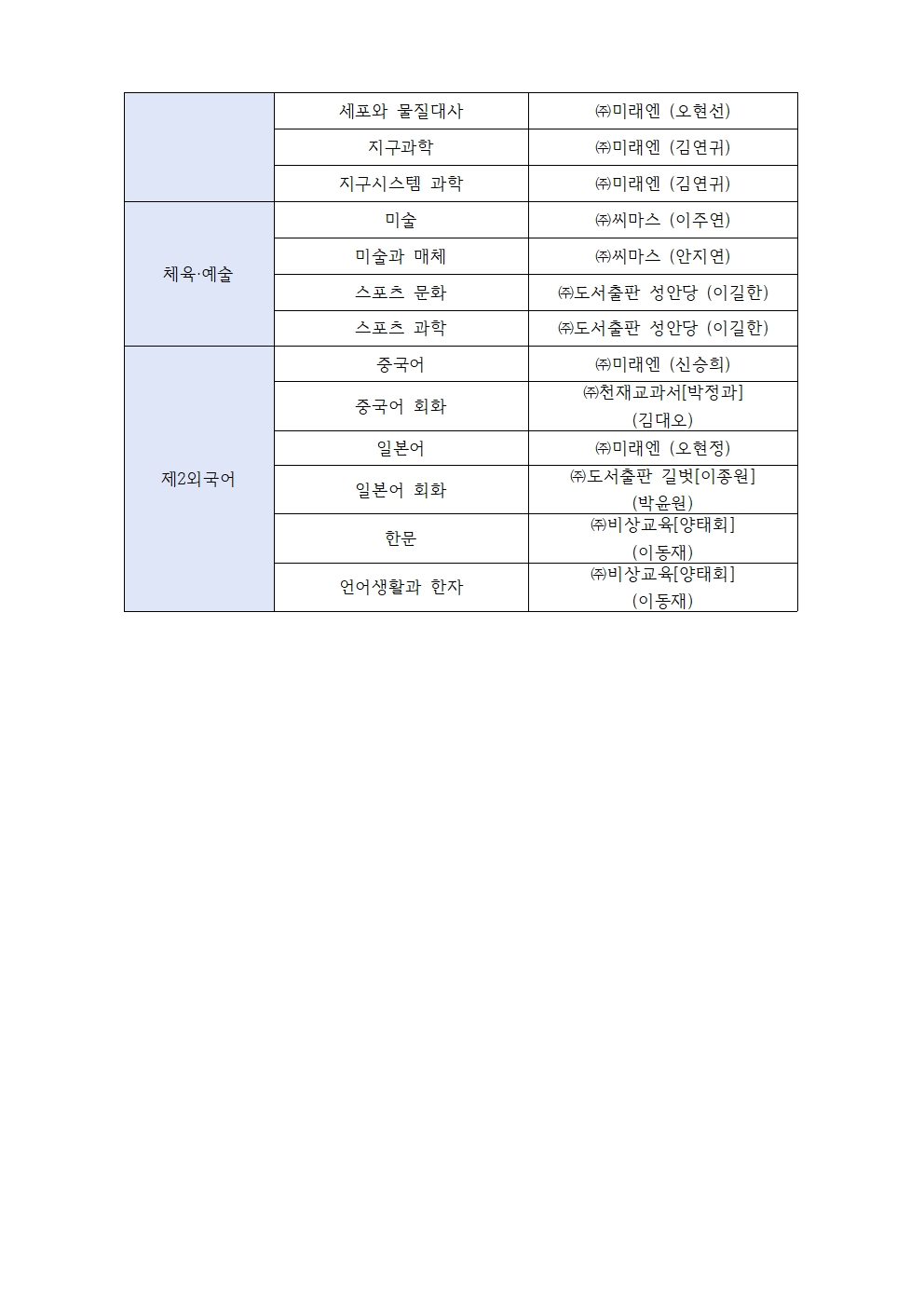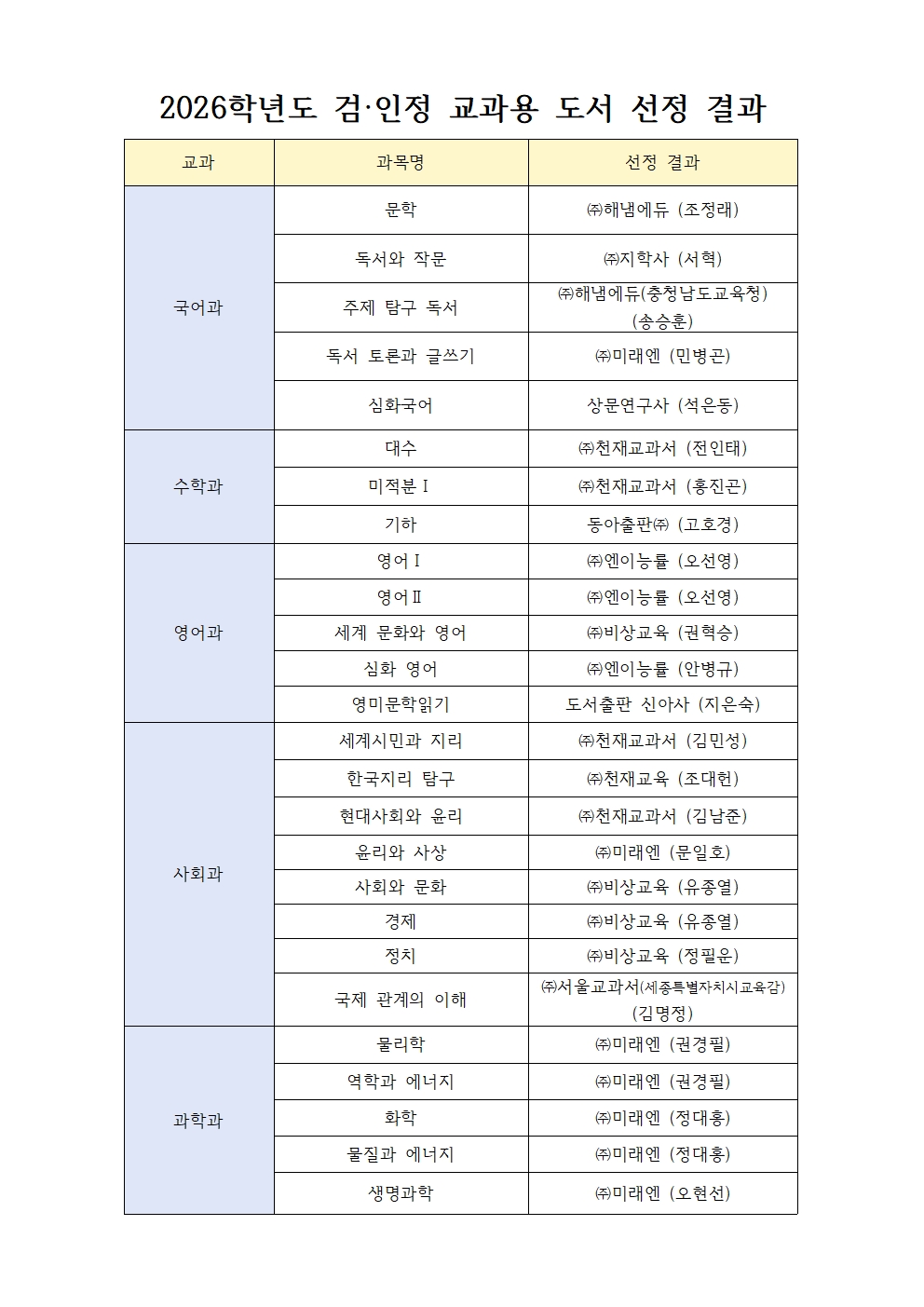 올해 새롭게 선정된 2026학년도 교과서의 출판사 목록입니다.